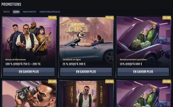 Notre programme de fidélité vous permet de gagner des Coins via les mises, les dépôts et la participation aux tournois. Les Coins peuvent être dépensés dans la Boutique pour de l’argent bonus, des tours gratuits et des Bonus Crabs, ce qui laisse du choix au lieu d’imposer un seul type de récompense. Nous proposons aussi un programme VIP à 5 niveaux pouvant augmenter les limites et débloquer des avantages spéciaux au fil du temps. Si vous comparez un Mafia bonus à d’autres sites, vérifiez à la fois le montant du match et les règles de mise, puis choisissez ce qui correspond à votre budget. Nous utilisons aussi parfois des offres ciblées, et chaque Mafia bonus est affiché avec ses conditions complètes dans votre compte.