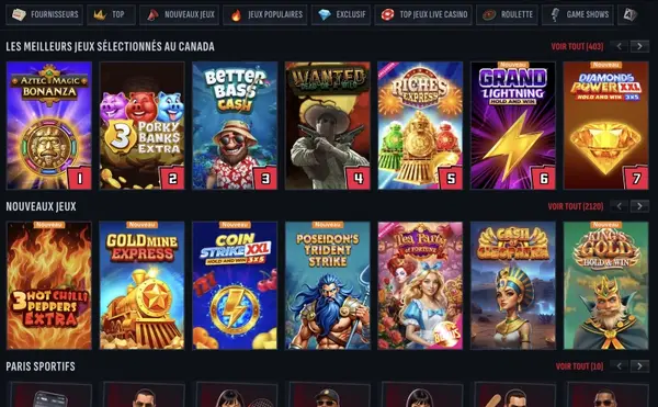 Nous proposons aussi des offres sport séparées pour les joueurs qui veulent démarrer avec les paris. Le bonus sport sur premier dépôt au Canada est un match de 100% jusqu’à 150 CAD. Si vous aimez la valeur hebdomadaire, il existe aussi un bonus reload sport de 50% jusqu’à 750 CAD une fois par semaine, plus 10% de cashback sport sur les pertes sport hebdomadaires jusqu’à 750 CAD.